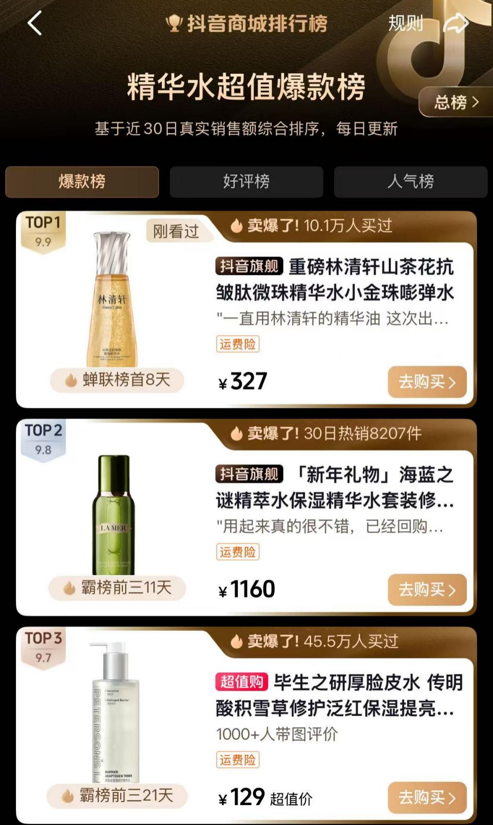 2025 年7月推出的「小金珠」嘭弹水,至本年1月26日不仅罢了累计售出 535万瓶、狂揽3亿元的亮眼收成;更蛊卦多月越过兰蔻、赫莲娜等海外大牌,稳坐天猫爽肤水类目榜单 TOP1、抖音精华水超值爆款榜单 TOP1,成为国货高端护肤新晋爆品。